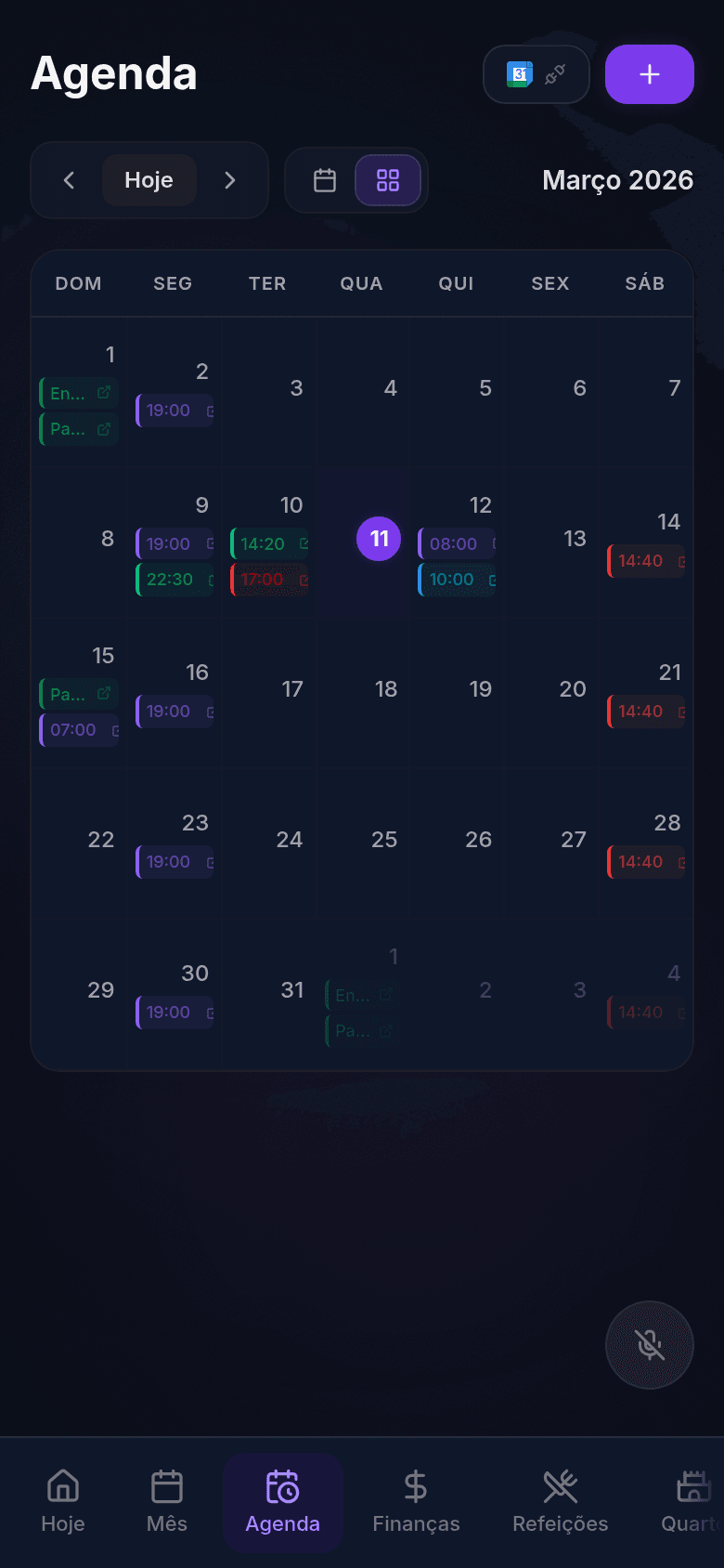 Sincronização bidirecional com Google Calendar. Eventos locais com cores customizáveis, recorrência e categorias. Tudo no mesmo lugar que seus hábitos e tarefas.