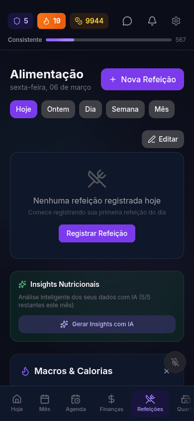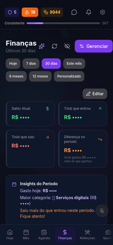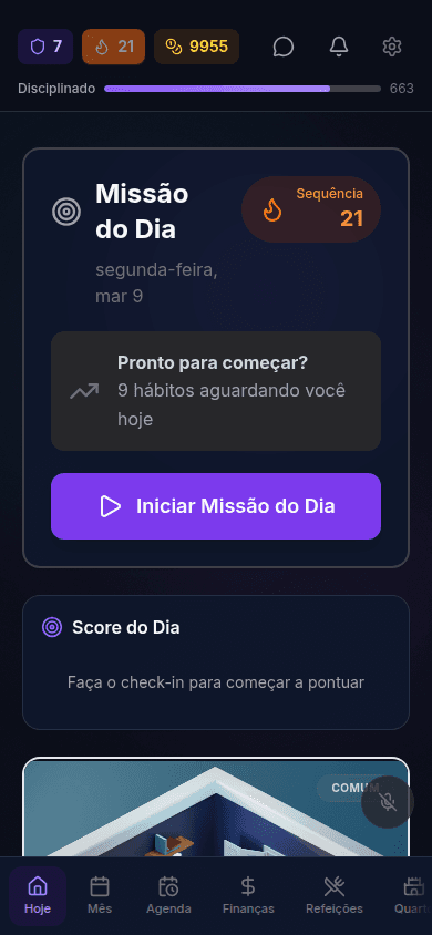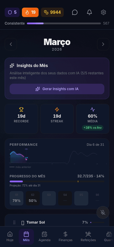 Hábitos, finanças, nutrição, tarefas, produtividade e calendário — tudo num único lugar, com IA e gamificação que tornam impossível abandonar.