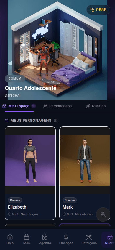 Decore seu quarto virtual com moedas ganhas pela sua consistência. Loja com raridades — do comum ao lendário. Personagens colecionáveis e renderizações 3D em tempo real.