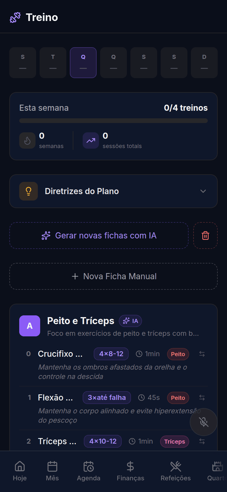 Monte seus treinos ou use planos gerados pela IA. Acompanhe séries, repetições e carga em tempo real. Timer de descanso integrado, histórico de evolução e XP por exercício completado. Tudo conectado ao seu sistema de hábitos e gamificação.
